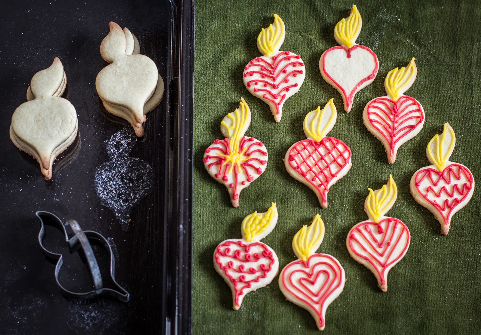 If you don't have a cookie cuter in the form of a flaming heart, you could cut the shape out of paper and use the tip of a sharp knife to cut it out of the dough.